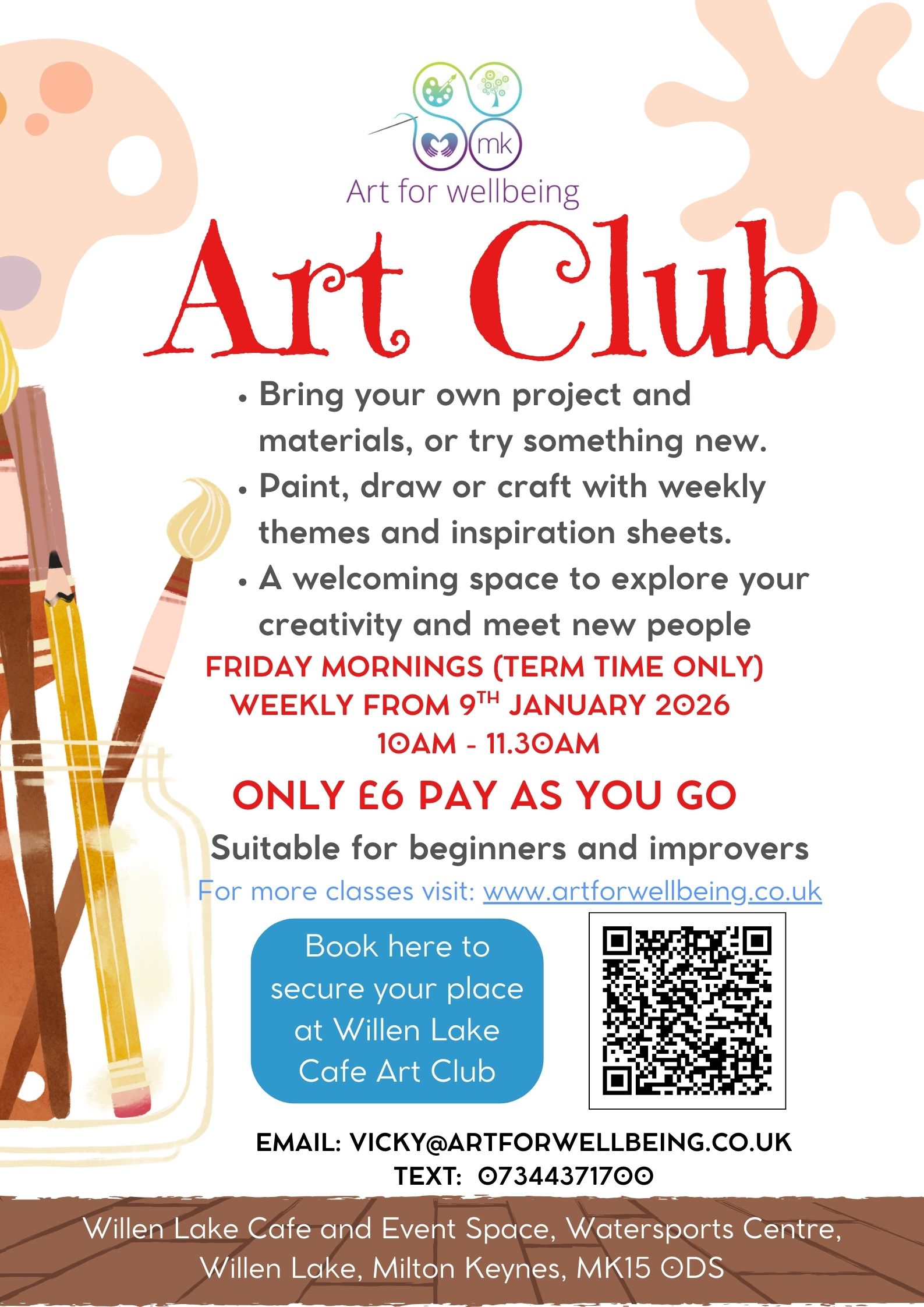 Transform your Friday mornings into a creative haven at our Friday Art Club, held upstairs in the Willen Lake Watersports Café. With stunning lake views and a relaxed atmosphere, it’s the perfect place to unwind, make art, and connect with others. 10am – 11.30am. Or, choose to stay longer and enjoy some food from the cafe.